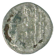| Arabian Abi'el-type Alexander imitative drachm, 3.8g, Eastern Arabia, c. 2nd century BC, Potts Class S4 (No. 286 this coin). This imitative drachm comes from south of Macedonia in eastern Arabia. It's probably an ancestor to the Arabian Alexander tetradrachm illustrated above and the Arabian Alexander obol illustrated immediately below. The iconography is more realistically rendered, though it's the same Abi'el type. All three of these coins are likely descendants of the same very realistically rendered coins minted by King Abi'el during the late 3rd or early 2nd century BC. This specimen has a "horn" that distinctively hooks over Herakles' ear. Other distinctive elements, to the reverse right, are a three-pronged anchor that faces down and two crescents underneath them. Zeus' abdominal muscles are particularly well defined, and he appears to be crossing his legs. His face is simply rendered as hair, nose, and chin. This coin, likely an earlier imitation, appears to be made of silver. |
