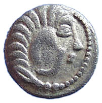 AE-18, Thrace, c. 3rd to 2nd century BC. This bronze imitative is similar to the previous one, though the nose is so large that it may have been engraved to be deliberately comical. With this piece, the bow is now divided into not two but three different pieces. |