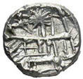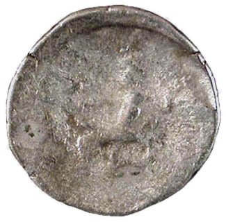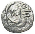 | Arabian Abi'el-type Alexander imitative obol, 0.78g, Eastern Arabia, c. 1st century BC, Potts Class XLVII, SNG Cop. Supplement 1239. The above beautifully abstracted Alexander Arabian obol is is in the same Potts class as the Alexander Arabian tetradrachm pictured on this page. But there are some interesting differences. On the obverse, Herakles' eye is now defined by two parallel lines rather than an almond-shaped border. On the reverse, Zeus' head is rendered as a sunburst, with spikes of hair coming out of a featureless face, which may represent the solar deity worshipped by the pre-Islamic people of the area. The horse he's holding on his right arm is rendered with more detail. And his breasts appear as two globules. Unlike the tetradrachm, this obol appears to be made of silver rather than billon. Potts identifies some of these abstracted obols as being made of silver, some of billion. |