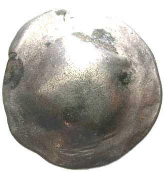 III tetradrachm from Arados, Phoenicia, M.J. Price P151. This and the next two coins are examples of the most commonly seen imitations of Alexander-type tetradrachms. They're actually copies of Philip III pieces, attempting as they do to copy his inscription as well. The above coin has a fully struck obverse and reverse. The specimens below represent varities in which only the obverse or reverse is fully struck. These coins have scyphate (cup-shaped) flans, with a sharply convex obverse and a concave reverse. The symbols in the reverse left field are a double-headed ax and sometimes a sun. Herakles on this type always has the same elongated nose. These coins are better documented than most imitatives, with the best English-language source I've found being Derek Allen's posthumously published 1987 Catalogue of the Celtic Coins in the British Museum, Vol. One: Silver Coins of the East Celts and Balkan Peoples, abbreviated as CCCBM. Other sources include Ivo Lukanc's 1996 book Les imitations des monnaies d'Alexandre le Grand et de Thasos and Karl Pink's 1939 book Die Münzprägung der Ostkelten und ihrer Nachbarn. |