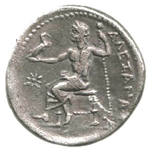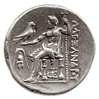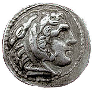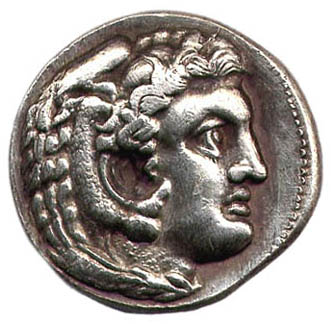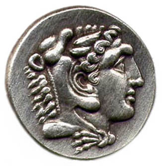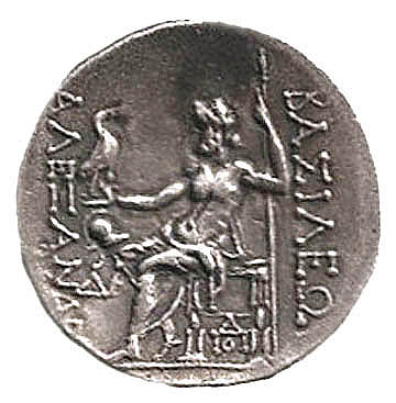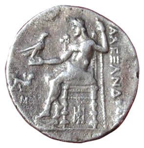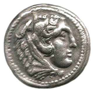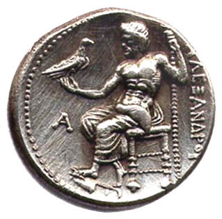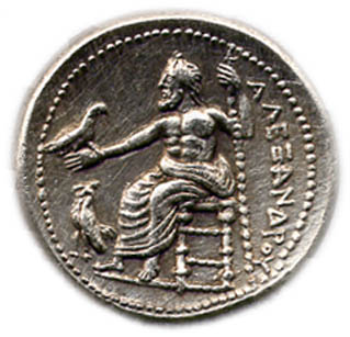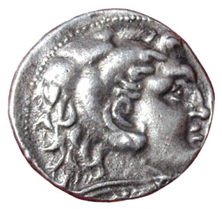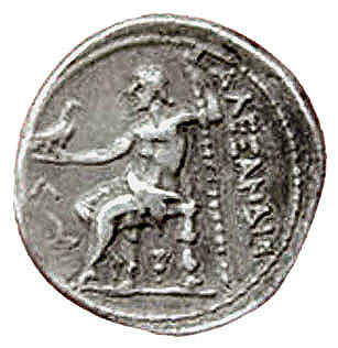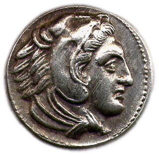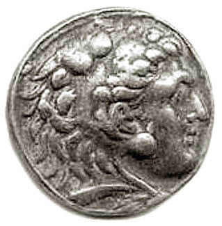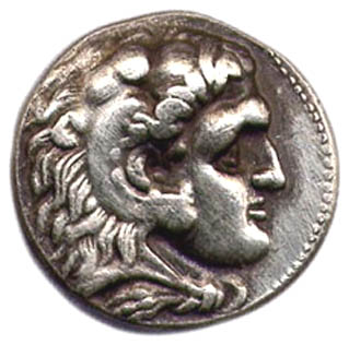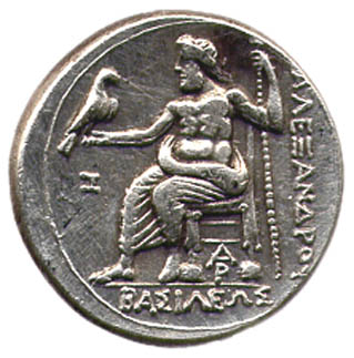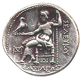 | This is a fake of a Seleukos tetradrachm rather than an Alexander tetradrachm, with the reverse inscription translating into "Of Seleukos." Tetradrachms minted in Alexander's style, with an obverse portrait of Herakles and the reverse depicting a seated Zeus, were issued not only by Alexander but also by Philip III, Seleukos I (and his successors Antiochos I, Antiochos II, and Seleukos II, who sometimes used Seleukos' inscription, sometimes their own), Lysimachos, Antigonos II, the Paeonian dynast Audoleon, and the Thracian dynasts Kersibaulos and Kavaros. | |||||||||