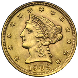 FACE OFF On the left, Alexander the Great lifetime gold stater minted in Abydos, Asia Minor, c. 328-323 BC, 17mm in diameter, 8.6g in weight, .997 fine gold, depicting the ancient Greek goddess Athena. On the right, U.S. 2-1/2 dollar gold piece (quarter eagle) minted in Philadelphia, Pennsylvania, in 1902, 18mm in diameter, 4.2g in weight, .900 fine gold, depicting the modern U.S. "goddess" Liberty (photo of quarter eagle courtesy of CoinFacts.com). |