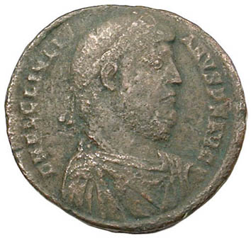 Julian II bronze modern forgery (26mm, 8.4g). This is a "Bulgarian School" forgery. It's a deceptive forgery, just a bit small, with convincing surfaces, edges, and patina. The styling is off only slightly, with Julian's face being too flat and his nose too shallow and the bull's head not facing heavenward. It was part of a small group of inexpensive coins that were all false. It copies a coin from Thessalonica, Greece, RIC VIII Thessalonica 225. |