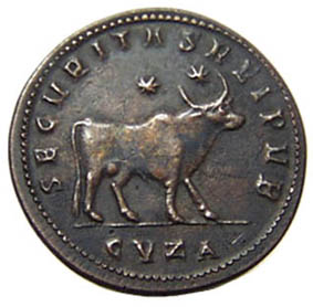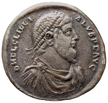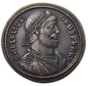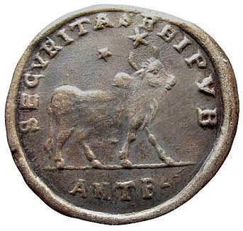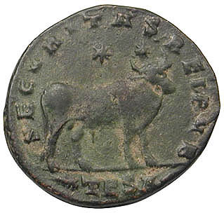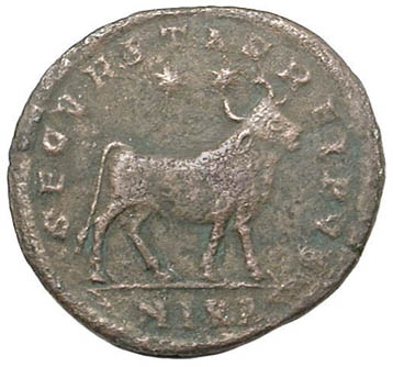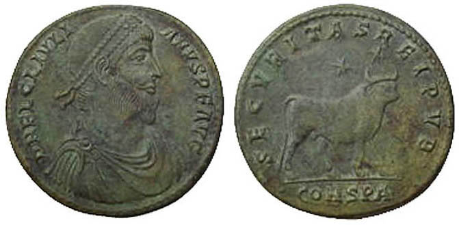 Julian II was the last Roman emperor to embrace paganism, though he failed in his three-year attempt as emperor to revive the worship of the old gods. The bull on his largest bronze coins was a proclamation of paganism. In Michael F. Hendy's 2008 book Studies in the Byzantine Monetary Economy C. 300-1450, he contended that these coins were the main element of Julian's efforts. Throughout history, in Rome as well in other culture, the bull has represented strength, masculinity, procreative power, and aggression. The bull on these coins is most commonly referred to as the Apis, a bull deity first worshipped in Egypt about two thousand years earlier. But it could also be Taurus, the sacred bull that survives in the constellation of the same name. What follows are one authentic official Julian II bull bronze coin issued c. 360-363 AD plus copies of this coin that span the ages. |