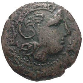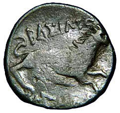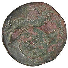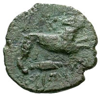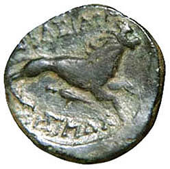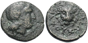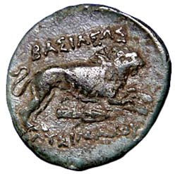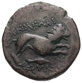 The reverse of this bronze coin depicts a running or leaping lion and a spear head along with the legend, in Greek,