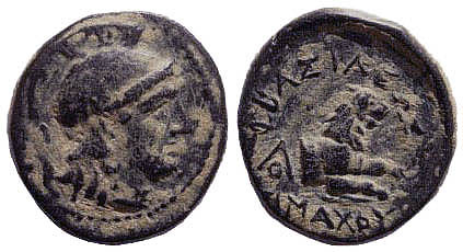 those of Lysimachos. The course features of the devices and the illiterate, globularized legend reveal this coin