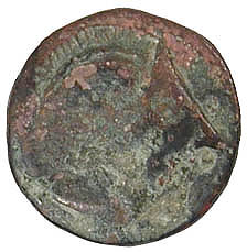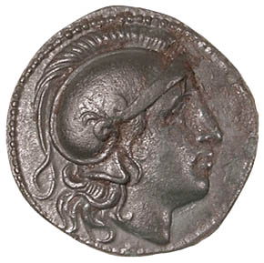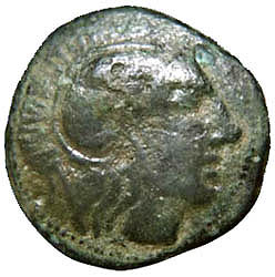 This tribal imitative is most distinguished by the exaggerated helmet crest and low-relief fabric. The lion appear to be turning its head three-quarters frontward, but this is just an illusion caused by lighting and small chips in the coin's patina. |