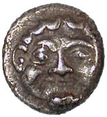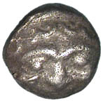 tongue visibly and rudely sticking out, and on the reverse an incuse punch used in the minting process of the earliest