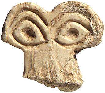 Ancient Mesopotamian eye figurine head (25mm tall, 27mm wide, 5-8mm thick, 5.75g). This doesn't represent an Owl, but it shares a connection. It's a piece of ancient art, primitively yet evocatively designed, from the origins of civilization, ancient Mesopotamia, made c. 3200 BC. At over 5,000 years old, this eye figurine head is older than the Pyramids of Giza. The first civilizations are widely believed to have begun in Mesopotamia and Egypt between 3500 and 3000 BC. This piece was found in northern Mesopotamia along with thousands of similar pieces excavated at an ancient Mesopotamian temple now called the Eye Temple because of this and other ancient artwork found there. These eye figurines were incorporated into the mortar with which the mudbrick temple was built. The temple remains are located near Tell Brak, also known as Tal Brak, Tall Birak, or Brak/Nagar, in present-day northeastern Syria. A tell is a mound formed over a long period from the remains of previous settlements. Tell Brak was one of the first large cities in Mesopotamia, developing contemporaneously with better known cities of southern Mesopotamia such as Ur and Uruk. Tell Brak was first officially excavated by British archeologist Max Mallowan, husband of novelist Agatha Christie, in 1937-38. These ancient eye figurines could be bought openly at various markets in Syria and Iraq into the middle of last century. Evidence of modern forgery includes modern tool marks seen under magnification and elaborate individualizing characteristics such as hair. I bought the above piece through a Harlan J. Berk auction from an antiquities collector and consultant, who had bought it through a Leslie Hindman Auctioneers estate auction in the early 1990s. The most credible theory of the purpose of these eye figurines is that they were used as votive offerings, or gifts, to a god or gods, representing the people who offered them (which makes the name often used for them, "eye idol," a misnomer). A competing theory, proposed by Mallowan, is that they represented the Sumerian fertility goddess Inanna (and thus were idols). Inanna was later identified with the Semitic goddesses Ishtar and Astarte, the Egyptian Isis, the Greek Aphrodite, the Etruscan Turan, and the Roman Venus. Perhaps the same general image served the purposes of both votive and idol, with worshippers fashioning figurines of themselves patterned after their eye goddess, offering themselves to her, and fashioning a larger statue with similar eyes, now lost, before which they worshipped. It's also unclear exactly what the eyes signify. Wide-eyed figures are common on other early Mesopotamian art, and artwork with disproportionately large eyes is found in many other ancient cultures as well, from prehistoric Britain to India. Thus this particular icongraphy must necessarily have served a primordial yearning. The meaning of the eyes likely falls into one, or perhaps more than one, of three areas: wisdom, pretection, and sexuality. Wide eyes are all-seeing, and thus all-knowing. It's here that there's a connection to the Owls of Athens, with the wide eyes of both Athena, goddess of wisdom, and her owl seeing all, knowing all. Wide eyes are also attentive, watching over and protecting. And wide eyes can signify sexual attraction and excitement. Eyes have served similar purposes throughout the millennia. The Eye of Providence, enclosed in a triangle and surrounded by light rays, was incorporated into the Great Seal of the United States when it was adopted in 1782, and even more visibly it has appeared on the U.S. $1 bill since 1935. The Eye of Providence is an all-seeing eye that's sometimes interpreted as symbolizing the eye of God keeping watch over humanity. Like the modern owl figurine pictured on this page, the ancient eye figurine head pictured above is made of gypsum, a soft calcium-based mineral. Other similar eye figurines found at Tell Brak were made of alabaster (another type of gypsum), limestone, marble (rock formed by alteration of limestone or dolomite), steatite (soapstone), and bone. Tell Brak eye figurines are flat, plank-type artifacts, with iconography on only one side. Other Mesopotamian eye figurines are round and three-dimensional, with the eyes portrayed as an open cylinder, though Tell Brak types are the most common. Most Tell Brak eye figurines consist of one figure, some consist of two conjoined figures, likely signifying a husband and wife, others depict a larger figure embracing a smaller one, likely signifying a mother and child, and a few are adorned with a conical hat, likely signifying a priest. Most were found broken, often as with the piece pictured above with the head having broken off from the body. Sometimes heads are reattached to bodies, though any given head may not be reattached to the body it was originally attached to. With all Tell Brak eye figurines, the body like most of the face is featureless, the emphasis being strictly on the eyes -- two pupils, two orbits, and one unibrow. |