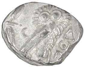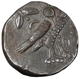 Egyptian Imitative Classical Owl tetradrachm (17.1g), Egypt, c. 413-343 BC, SNG Delepierre 1457-1459, Buttrey/Flament Style X, van Alfen (2002) Plate 11 No. 1. Unlike the Classical Owls on the first page of this site, this specimen is clearly not of Athenian origin. It features on the obverse a frontal eye, like 5th century Athenian Owls, but the owl on the reverse has coarser feathers, like 4th century Athenian profile-eye Owls. Athena's lips and the shape of her face are also very un-Athenian. This coin was minted during a period of Egyptian independence near the end of the great Pharaonic Age in Egypt that began c. 3100 BC. Persia reconquered Egypt c. 343 BC. I cover Egyptian Owls of this period in more detail at my page on Athenian vs. Egyptian Owls. Peter van Alfen of the American Numismatic Society covered the above type along with others in a series of five excellent articles on imitative Owls in the American Journal of Numismatics 12 (2000), the American Journal of Numismatics 14 (2002), and the American Journal of Numismatics 15/16 (2004/2005). |